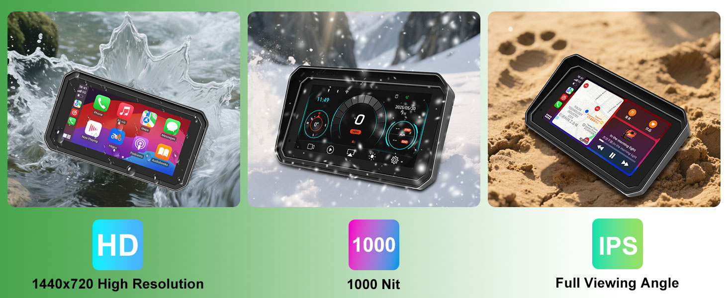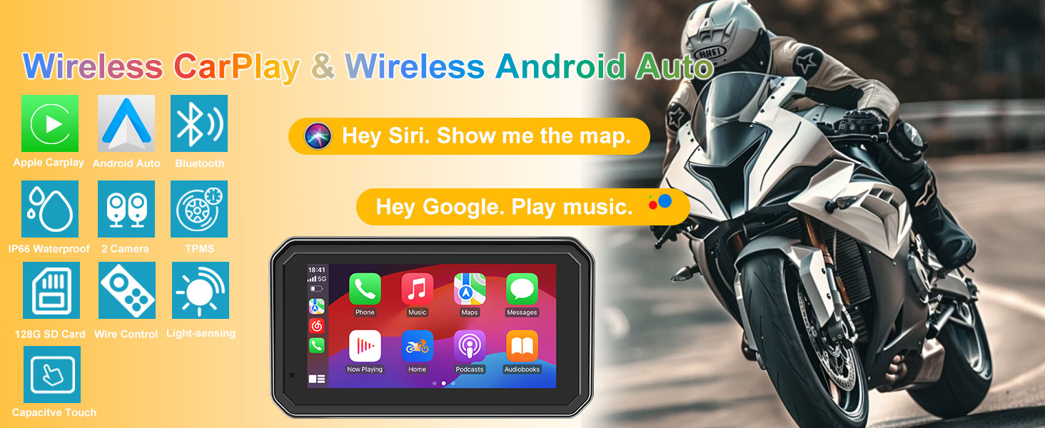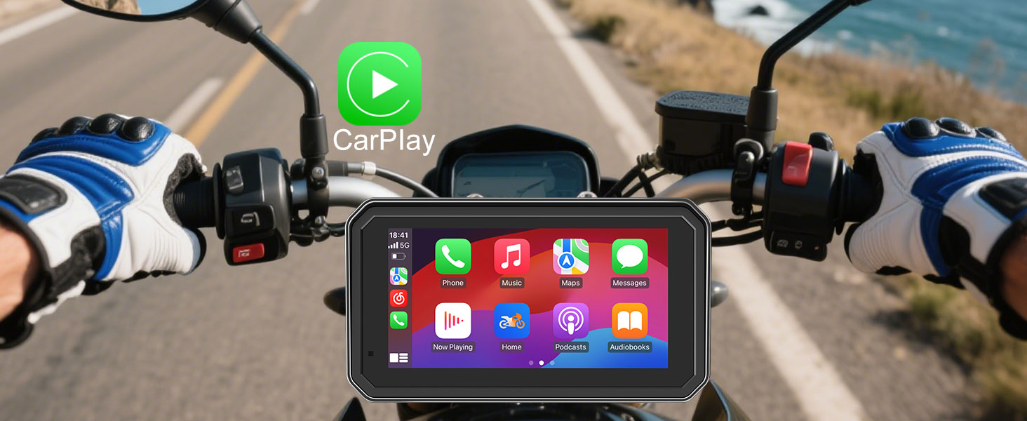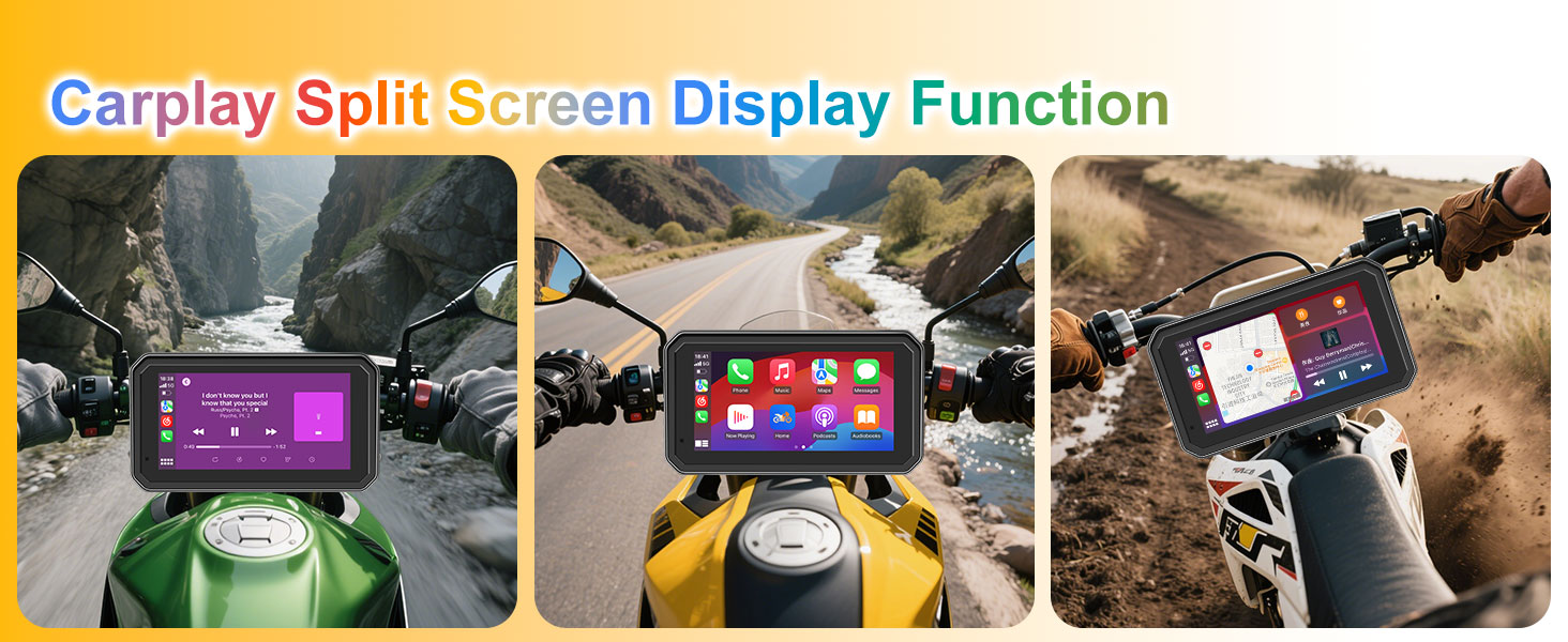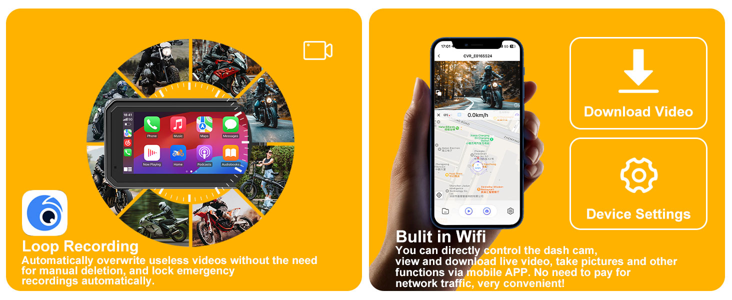 This 6-inch CarPlay motorcycle device includes front and rear 1080P dash cams, supporting split screen display and recording your journey. The set includes a 128GB SD card for loop recording and gravity sensor functionality. Built in WiFi allows you to view, play, and download videos in real-time, and watch them directly on your smartphone.