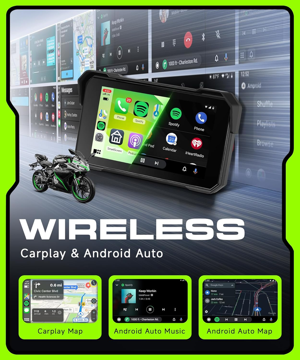 Motorcycle CarPlay Screen 5-inch portable wireless CarPlay Android Auto suitable for motorcycle waterproof touch screen, supports GPS navigation, Bluetooth, motorcycle IP68 waterproof, voice control
